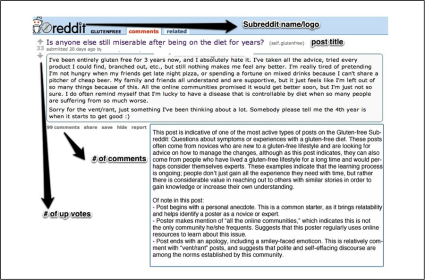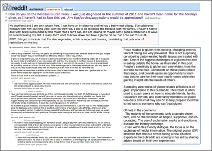 Given their breadth of subject matter, from the scholarly to the creepy, popular Subreddits may amass large followings for a variety of reasons. An example of a Subreddit that is intended to provide supportive information is the gluten-free Subreddit. This Subreddit, which averages more than 5,500 readers, is a forum for people who maintain a gluten-free diet, most commonly due to “Celiac Disease, Dermatitis herpetiformis, Eosinophilic esophagitis, Leaky Gut Syndrome, Hashimoto’s thyroiditis, gluten ataxia, and general gluten sensitivity.”7 This Subreddit provides tips and advice for how to live gluten-free and how to avoid gluten exposure, links to medical research and reports from the mass media, as well as general support for those new to the lifestyle or dealing with a new issue.