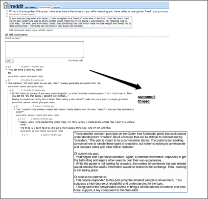 Posts of this variety almost always begin with a personal anecdote. These stories serve as context for the question, but they also personalize the subjects by shedding some light on their experience and who they are. (Reddit users do not identify themselves, but they often share certain demographic information like age, gender, and location.) Personalization is an important part of the knowledge exchange, as it makes the poster relatable to different users on a variety of personally meaningful levels.32 For instance, in the example above, the original poster (OP) indicates he or she has been gluten-free for three years. Revealing some personal information may signal other long-time dieters to share their own experiences, as they may provide a new perspective or simply just acknowledge a level of understanding. In these instances, the OP is looking for practical suggestions on how to live a healthy and productive life while gluten-free. Linking to outside sources such as scientific research and other medical resources is encouraged, but it is often the wisdom that comes from within the community that garners the most dialogue. For many living gluten-free lives, the amateur provides a greater wealth of information than the medically trained expert. Gee and Hayes note that the blending of the scientific and the personal is common within affinity spaces.33 Although users come to the gluten-free Subreddit for specialized information, the present analysis indicates users most commonly share posts with the goal of seeking or providing emotional support. In the example in figure 1, the OP makes reference to “all the online communities,” illustrating the fragmentation of information that can occur on the web. While a particular affinity space will not necessarily have all the information one is seeking, the ongoing participation process can enrich the archives over time so that it becomes a valuable central resource.