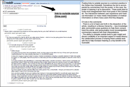 The gluten-free Subreddit is used largely for sharing experiences and seeking advice and support. However, community members also help one another by sharing pertinent information beyond personal experience, which helps to create a more comprehensive body of information. Members extend their own knowledge by linking to other helpful online resources, including other discussion groups, medical research, news reported by the mass media, and recipes. By locating, assessing, and sharing these resources, community members are engaging in the literacy practices described by Moore,25 most notably the ability to extract and synthesize information from a variety of sources for productive purposes. As users spend more time in the space, then, they are learning not only how to navigate within the norms and procedures defined by the group, but also how to effectively utilize the web as a broader resource. This creates a “demand-pull” approach to learning whereby the community determines what is of value and then seeks out such information and remixes and shares it in a way that best serves its purposes.26 The understanding of the content in an affinity space is then socially constructed by the members who post and comment on it to create what Levy calls “collective intelligence.”27